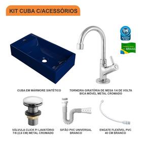 Sobre o ProdutoKit Cuba RL545 C/Torneira 1198 Metal + Válvula Click 1''G + Sifão Pvc + Flexível AmareloDescrição do ProdutoO Kit KTCARL545W.AM.1198.AP03 é uma combinação perfeita da Cuba de Apoio CARL545W.AM com acessórios complementares, prontos para instalação no seu lavabo ou móvel de banheiro. Ele conta com 1 Cuba de Apoio Retangular Roma 54,5X28,6cm Amarelo + 1 Torneira de Mesa p/Lavatório SL1198 1/4 Volta Metal Cromado + 1 Válvula P/Lavatório Click Up 1" (2,6cm) V03 Metal Cromado + 1 Sifão Pvc Universal Branco + 1 Engate Flexível Pvc Branco 40cm + 0 , todos compatíveis e prontos para instalação.Itens Inclusos:1 Cuba de Apoio + 1 Torneira de mesa baixa + 1 Válvula de Escoamento Clik Up + 1 Sifão PVC Universal Branco + 1 Engate Flexível 40cm Informações Logísticas:Vol.01 Comp.: 59,5cm Prof.: 34,5cm Alt.: 18cm Peso Bruto: 7,676Kg Observações:Não acompanha acessórios decorativos. Imagens meramente ilustrativas.Informações Técnicas / CaracterísticasCuba de Apoio Retangular Roma 54,5X28,6cm Amarelo Cor: Amarelo Marca: Compace Modelo: CARL545 Linha: Conect Formato: Retangular Tipo de Cuba: Apoio Material: Mármore Sintético Acabamento: Hard Lacca PU Escala de Brilho: Brilho Possui Ladrão: Não Possui Furação para Torneira: Sim Diâmetro do Furo para Torneira: (32mm) - DN 32 Diâmetro do Furo para Válvula: (40mm) - DN 40 Comprimento: 54,5cm Largura: 28,6cm Altura: 12,7cm Peso Líq.: 6,3Kg Recomendações de Uso, Manutenção e Limpeza: Utilize flanela seca ou pano macio, levemente umedecido com água. Evite contato com produtos químicos e abrasivos (solventes, thinner, acetona etc) e não utilize nenhum tipo de esponja de aço. Para maior brilho, recomendamos a utilização de cera automotiva n 2. Necessita de Montagem: Sim / Acompanha Manual de Montagem Complexidade da Montagem: Média: pode ser montado por mais de uma pessoa e/ou necessite de maior conhecimento para montagem. Garantia: 6 mesesTorneira de Mesa p/Lavatório SL1198 1/4 Volta Metal Cromado Cor: Cromado Marca: Compace Modelo: SL1198 Linha: Slim Tipo de Torneira: Convencional Local: Lavatório Tipo de Instalação: De Mesa Acabamento: Camada de Cromo Salt Spray. Possui alta resistência contra corrosão, maresia, oxidação e descascamento. Material: Liga de Cobre (Bronze e Latão), Inox, Zamac, Elastômeros e Plásticos de Engenharia Possui Arejador Sim Tipo de Bica: Móvel Pressão Máxima: 40 m.c.a. Pressão Mínima: 2 m.c.a. Temperatura da Água Indicada: Mín.: 5 Celsius / Máx.: 70 Celsius Bitola do Cano: 1/2" Altura Total: 19cm Altura da base até a saída da água: 13cm Profundidade da saída da água até o final do cano: 11,5cm Peso Líq.: 0,26Kg Recomendações de Uso, Manutenção e Limpeza: Limpar apenas com pano macio e sabão neutro. Não usar produtos abrasivos como sapólio, palha de aço e produtos químicos. Garantia: 5 anosVálvula P/Lavatório Click Up 1" (2,6cm) V03 Metal Cromado Cor: Cromado Marca: Compace Modelo: CO1613V03 Linha: Complementos Tipo: Click Local: Lavatório Acabamento: Cromado Material: Zamak, Elastômeros e Plásticos de Engenharia. Bitola do Cano: 1" Possui Ladrão: Não Altura: 8cm Diâmetro: 5,7cm Altura Total: 9cm Peso Líq.: 0,15Kg Recomendações de Uso, Manutenção e Limpeza: Limpar apenas com pano macio e sabão neutro. Não usar produtos abrasivos como sapólio, palha de aço e produtos químicos. Necessita de Montagem: Sim Complexidade da Montagem: Média: pode ser montado por mais de uma pessoa e/ou necessite de maior conhecimento para montagem. Garantia: 5 anosSifão Pvc Universal Branco Cor: Branco Marca: Compace Modelo: SPVC Linha: Complementos Tipo: Flexível Local: Multiuso Acabamento: PVC Material: PVC Bitola do Cano: Universal Temperatura da Água Indicada: Mín.: 0 Celsius / Máx.: 90 Celsius Comprimento: 29cm Diâmetro: 5cm Comprimento Total: 71cm Peso Líq.: 0,1Kg Recomendações de Uso, Manutenção e Limpeza: Limpar apenas com pano macio e sabão neutro. Não usar produtos abrasivos como sapólio, palha de aço e produtos químicos. Necessita de Montagem: Sim Complexidade da Montagem: Média: pode ser montado por mais de uma pessoa e/ou necessite de maior conhecimento para montagem. Garantia: 01 anoEngate Flexível Pvc Branco 40cm Cor: Branco Marca: Compace Modelo: FLEX Linha: Complementos Tipo: Flexível Local: Multiuso Acabamento: PVC Material: PVC Bitola do Cano: Universal Pressão Indicada: 40 m.c.a. Temperatura da Água Indicada: Fria Comprimento: 40cm Diâmetro: 2cm Peso Líq.: 0,08Kg Recomendações de Uso, Manutenção e Limpeza: Limpar apenas com pano macio e sabão neutro. Não usar produtos abrasivos como sapólio, palha de aço e produtos químicos. Necessita de Montagem: Sim Complexidade da Montagem: Média: pode ser montado por mais de uma pessoa e/ou necessite de maior conhecimento para montagem. Garantia: 01 ano