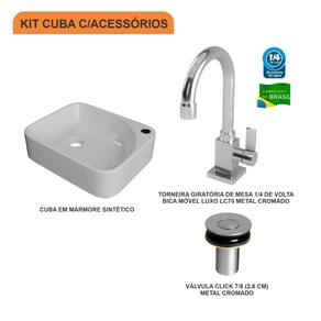 Sobre o ProdutoKit Cuba RO36 C/Torneira Luxo 1195 + Válvula Click 1''B (2,6cm) BrancaDescrição do ProdutoO Kit KTCARO360W.BR.LC70.V02 é uma combinação perfeita da Cuba de Apoio CARO360W.BR com acessórios complementares, prontos para instalação no seu lavabo ou móvel de banheiro. Ele conta com 1 Cuba de Apoio Retangular Cross 36,4cm Branca + 1 Torneira De Mesa Classic Luxo 1/4 De Volta 1195 C70 + 1 Válvula P/Lavatório Click Up Interno 1" (2,6cm) V02 Metal Cromado + 0+ 0+ 0 , todos compatíveis e prontos para instalação.Itens Inclusos:1 Cuba de Apoio + 1 Torneira de mesa baixa + 1 Válvula de Escoamento Clik Up Informações Logísticas:Vol.01 Comp.: 37,5cm Prof.: 37,5cm Alt.: 17cm Peso Bruto: 4,928Kg Observações:Não acompanha acessórios decorativos. Imagens meramente ilustrativas.Informações Técnicas / CaracterísticasCuba de Apoio Retangular Cross 36,4cm Branca Cor: Branca Marca: Compace Modelo: CARO360 Linha: Conect Formato: Retangular Tipo de Cuba: Apoio Material: Mármore Sintético Acabamento: Hard Lacca PU Escala de Brilho: Brilho Possui Ladrão: Não Possui Furação para Torneira: Sim Diâmetro do Furo para Torneira: (32mm) - DN 32 Diâmetro do Furo para Válvula: (40mm) - DN 40 Comprimento: 36,4cm Largura: 29,5cm Altura: 9,7cm Peso Líq.: 3,4Kg Recomendações de Uso, Manutenção e Limpeza: Utilize flanela seca ou pano macio, levemente umedecido com água. Evite contato com produtos químicos e abrasivos (solventes, thinner, acetona etc) e não utilize nenhum tipo de esponja de aço. Para maior brilho, recomendamos a utilização de cera automotiva n 2. Necessita de Montagem: Sim / Acompanha Manual de Montagem Complexidade da Montagem: Média: pode ser montado por mais de uma pessoa e/ou necessite de maior conhecimento para montagem. Garantia: 6 mesesTorneira De Mesa Classic Luxo 1/4 De Volta 1195 C70 Cor: Cromado Marca: Compace Modelo: CL1195 Linha: Classic Tipo de Torneira: Convencional Local: Lavatório Tipo de Instalação: De Mesa Acabamento: Camada de Cromo Salt Spray. Possui alta resistência contra corrosão, maresia, oxidação e descascamento. Material: Liga de Cobre (Bronze e Latão), Inox, Zamac, Elastômeros e Plásticos de Engenharia Possui Arejador Sim Tipo de Bica: Móvel Pressão Máxima: 40 m.c.a. Pressão Mínima: 2 m.c.a. Temperatura da Água Indicada: Mín.: 5 Celsius / Máx.: 70 Celsius Bitola do Cano: 1/2" Altura Total: 23cm Altura da base até a saída da água: 15cm Profundidade da saída da água até o final do cano: 14cm Peso Líq.: 0,48Kg Recomendações de Uso, Manutenção e Limpeza: Limpar apenas com pano macio e sabão neutro. Não usar produtos abrasivos como sapólio, palha de aço e produtos químicos. Garantia: 5 anosVálvula P/Lavatório Click Up Interno 1" (2,6cm) V02 Metal Cromado Cor: Cromado Marca: Compace Modelo: CO1612V02 Linha: Complementos Tipo: Click Local: Lavatório Acabamento: Cromado Material: Zamak, Elastômeros e Plásticos de Engenharia. Bitola do Cano: 1" Possui Ladrão: Não Altura: 7cm Diâmetro: 5,5cm Altura Total: 8cm Peso Líq.: 0,11Kg Recomendações de Uso, Manutenção e Limpeza: Limpar apenas com pano macio e sabão neutro. Não usar produtos abrasivos como sapólio, palha de aço e produtos químicos. Necessita de Montagem: Sim Complexidade da Montagem: Média: pode ser montado por mais de uma pessoa e/ou necessite de maior conhecimento para montagem. Garantia: 5 anos