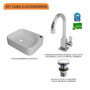 Sobre o ProdutoKit Cuba RO36 C/Torneira Luxo 1195 + Válvula Click 1''G BrancaDescrição do ProdutoO Kit KTCARO360W.BR.LC70.V03 é uma combinação perfeita da Cuba de Apoio CARO360W.BR com acessórios complementares, prontos para instalação no seu lavabo ou móvel de banheiro. Ele conta com 1 Cuba de Apoio Retangular Cross 36,4cm Branca + 1 Torneira De Mesa Classic Luxo 1/4 De Volta 1195 C70 + 1 Válvula P/Lavatório Click Up 1" (2,6cm) V03 Metal Cromado + 0+ 0+ 0 , todos compatíveis e prontos para instalação.Itens Inclusos:1 Cuba de Apoio + 1 Torneira de mesa baixa + 1 Válvula de Escoamento Clik Up Informações Logísticas:Vol.01 Comp.: 37,5cm Prof.: 37,5cm Alt.: 17cm Peso Bruto: 4,968Kg Observações:Não acompanha acessórios decorativos. Imagens meramente ilustrativas.Informações Técnicas / CaracterísticasCuba de Apoio Retangular Cross 36,4cm Branca Cor: Branca Marca: Compace Modelo: CARO360 Linha: Conect Formato: Retangular Tipo de Cuba: Apoio Material: Mármore Sintético Acabamento: Hard Lacca PU Escala de Brilho: Brilho Possui Ladrão: Não Possui Furação para Torneira: Sim Diâmetro do Furo para Torneira: (32mm) - DN 32 Diâmetro do Furo para Válvula: (40mm) - DN 40 Comprimento: 36,4cm Largura: 29,5cm Altura: 9,7cm Peso Líq.: 3,4Kg Recomendações de Uso, Manutenção e Limpeza: Utilize flanela seca ou pano macio, levemente umedecido com água. Evite contato com produtos químicos e abrasivos (solventes, thinner, acetona etc) e não utilize nenhum tipo de esponja de aço. Para maior brilho, recomendamos a utilização de cera automotiva n 2. Necessita de Montagem: Sim / Acompanha Manual de Montagem Complexidade da Montagem: Média: pode ser montado por mais de uma pessoa e/ou necessite de maior conhecimento para montagem. Garantia: 6 mesesTorneira De Mesa Classic Luxo 1/4 De Volta 1195 C70 Cor: Cromado Marca: Compace Modelo: CL1195 Linha: Classic Tipo de Torneira: Convencional Local: Lavatório Tipo de Instalação: De Mesa Acabamento: Camada de Cromo Salt Spray. Possui alta resistência contra corrosão, maresia, oxidação e descascamento. Material: Liga de Cobre (Bronze e Latão), Inox, Zamac, Elastômeros e Plásticos de Engenharia Possui Arejador Sim Tipo de Bica: Móvel Pressão Máxima: 40 m.c.a. Pressão Mínima: 2 m.c.a. Temperatura da Água Indicada: Mín.: 5 Celsius / Máx.: 70 Celsius Bitola do Cano: 1/2" Altura Total: 23cm Altura da base até a saída da água: 15cm Profundidade da saída da água até o final do cano: 14cm Peso Líq.: 0,48Kg Recomendações de Uso, Manutenção e Limpeza: Limpar apenas com pano macio e sabão neutro. Não usar produtos abrasivos como sapólio, palha de aço e produtos químicos. Garantia: 5 anosVálvula P/Lavatório Click Up 1" (2,6cm) V03 Metal Cromado Cor: Cromado Marca: Compace Modelo: CO1613V03 Linha: Complementos Tipo: Click Local: Lavatório Acabamento: Cromado Material: Zamak, Elastômeros e Plásticos de Engenharia. Bitola do Cano: 1" Possui Ladrão: Não Altura: 8cm Diâmetro: 5,7cm Altura Total: 9cm Peso Líq.: 0,15Kg Recomendações de Uso, Manutenção e Limpeza: Limpar apenas com pano macio e sabão neutro. Não usar produtos abrasivos como sapólio, palha de aço e produtos químicos. Necessita de Montagem: Sim Complexidade da Montagem: Média: pode ser montado por mais de uma pessoa e/ou necessite de maior conhecimento para montagem. Garantia: 5 anos