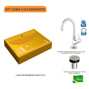 O Kit KTCART490W.CL.1198.V02 é uma combinação perfeita da Cuba de Apoio CART490W.CL com acessórios complementares, prontos para instalação no seu lavabo ou móvel de banheiro. Ele conta com 1 Cuba de Apoio Retangular RT49 50,5X40cm Colorida e 1 Torneira de Mesa para Lavatório SL1198 1/4 Volta Metal Cromado e 1 Válvula para Lavatório Click Up Interno 1 Polegada (2,6cm) V02 Metal Cromado, todos compatíveis e prontos para instalação. Acompanha Flexível: Não Acompanha Manual de Instalação: Sim Acompanha Sifão: Não Acompanha Torneira: Sim Altura: 10,5 cm Altura da Torneira: 19 cm Ambiente Principal: Banheiro Comprimento: 50,5 cm Comprimento do Flexível: cm Comprimento Máximo do Sifão: cm Comprimento Mínimo do Sifão: cm Cor: Amarelo Cor do Produto: Amarelo Diâmetro: cm Diâmetro do furo: 32 mm Diâmetro para válvula: 32 mm Espessura: mm Itens Inclusos: 1 Cuba de Apoio, 1 Torneira de mesa baixa, 1 Válvula de Escoamento Clik Up Largura: 40 cm Linha ou Coleção: Plus Manual de Montagem e Instalação: https://cdn2.madeiramadeira.com.br/atributo/compace/660424-ktcart490wcl1198v02.rar Material da Torneira: Latão Material Principal: Mármore Sintético Origem do Produto: Nacional Peso: 6,865 kg Possui furação para torneira: Sim Possui ladrão: Não Pressão Máxima da Torneira: 40 mca Pressão Mínima da Torneira: 2 mca Profundidade: cm Recomendações de Uso, Manutenção e Limpeza: Utilize flanela seca ou pano macio, levemente umedecido com água. Evite contato com produtos químicos e abrasivos (solventes, thinner, acetona etc) e não utilize nenhum tipo de esponja de aço. Para maior brilho, recomendamos a utilização de cera automotiva n° 2. Tipo de Acionamento da Torneira: 1/4 de volta Tipo de sifão: Flexível Válvula oculta: Não