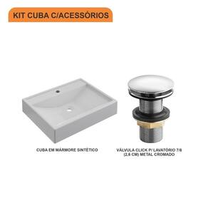 Sobre o ProdutoKit Cuba RT49 C/Válvula Click 1''G BrancaDescrição do ProdutoO Kit KTCART490W.BR.V03 é uma combinação perfeita da Cuba de Apoio CART490W.BR com acessórios complementares, prontos para instalação no seu lavabo ou móvel de banheiro. Ele conta com 1 Cuba de Apoio Retangular RT49 50,5X40cm Branca + 1 Válvula P/Lavatório Click Up 1 (2,6cm) V03 Metal Cromado + 0+ 0+ 0+ 0 , todos compatíveis e prontos para instalação.Itens Inclusos:1 Cuba de Apoio + 1 Válvula de Escoamento Clik Up Informações Logísticas:Vol.01 - Comp.: 61cm - Prof.: 43cm - Alt.: 17cm - Peso Bruto: 7,42Kg Observações:Não acompanha acessórios decorativos. Imagens meramente ilustrativas.Informações Técnicas / CaracterísticasCuba de Apoio Retangular RT49 50,5X40cm Branca- Cor: Branca- Marca: Compace- Modelo: CART490- Linha: Plus- Formato: Retangular- Tipo de Cuba: Apoio- Material: Mármore Sintético- Acabamento: Hard Lacca PU- Escala de Brilho: Brilho- Possui Ladrão: Não- Possui Furação para Torneira: Sim- Diâmetro do Furo para Torneira: (32mm) - DN 32- Diâmetro do Furo para Válvula: (32mm) - DN 32 - Comprimento: 50,5cm- Largura: 40cm- Altura: 10,5cm - Peso Líq.: 6,4Kg- Recomendações de Uso, Manutenção e Limpeza: Utilize flanela seca ou pano macio, levemente umedecido com água. Evite contato com produtos químicos e abrasivos (solventes, thinner, acetona etc) e não utilize nenhum tipo de esponja de aço. Para maior brilho, recomendamos a utilização de cera automotiva n 2.- Necessita de Montagem: Sim / Acompanha Manual de Montagem- Complexidade da Montagem: Média: pode ser montado por mais de uma pessoa e/ou necessite de maior conhecimento para montagem.- Garantia: 6 mesesVálvula P/Lavatório Click Up 1 (2,6cm) V03 Metal Cromado- Cor: Cromado- Marca: Compace- Modelo: CO1613V03- Linha: Complementos- Tipo: Click- Local: Lavatório- Acabamento: Cromado- Material: Zamak, Elastômeros e Plásticos de Engenharia.- Bitola do Cano: 1- Possui Ladrão: Não - Altura: 8cm- Diâmetro: 5,7cm - Altura Total: 9cm- Peso Líq.: 0,18Kg- Recomendações de Uso, Manutenção e Limpeza: Limpar apenas com pano macio e sabão neutro. Não usar produtos abrasivos como sapólio, palha de aço e produtos químicos.- Necessita de Montagem: Sim- Complexidade da Montagem: Média: pode ser montado por mais de uma pessoa e/ou necessite de maior conhecimento para montagem.- Garantia: 5 anos Formato: Retangular | Tipo de Cuba: Apoio | Material: Mármore Sintético | Acabamento: Hard Lacca PU Fosco | Escala de Brilho: Fosco | Possui Furação para Torneira: Sim | Diâmetro do Furo para Torneira: (32mm) - DN 32 | Diâmetro do Furo para Válvula: (32mm) - DN 32 | Itens Inclusos: 1 Cuba de Apoio + 1 Válvula de Escoamento Clik Up | Limite de unidades por venda: É possível comprar até 1 unidade por venda. | Quantidade máxima de pedido: 1 | Baterias são necessárias?: false Cor: Branco