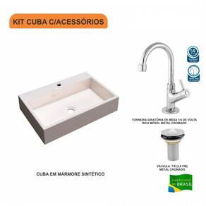 O Kit KTCART550W.CL.1198.V01 é uma combinação perfeita da Cuba de Apoio CART550W.CL com acessórios complementares, prontos para instalação no seu lavabo ou móvel de banheiro. Ele conta com 1 Cuba de Apoio Retangular Florenza 54X36,5cm Colorida e 1 Torneira de Mesa para Lavatório SL1198 1/4 Volta Metal Cromado e 1 Válvula para Lavatório 1 Polegada (2,6cm) V01 Metal Cromado, todos compatíveis e prontos para instalação. Acompanha Flexível: Não Acompanha Manual de Instalação: Sim Acompanha Sifão: Não Acompanha Torneira: Sim Altura: 11 cm Altura da Torneira: 19 cm Comprimento: 54 cm Cor: Bege Cor do Produto: Bege Diâmetro do furo: 32 mm Diâmetro para válvula: 40 mm Informações Complementares: Itens Inclusos: 1 Cuba de Apoio, 1 Torneira de mesa baixa, 1 Válvula de Escoamento Largura: 36 cm Linha ou Coleção: Conect Manual de Montagem e Instalação: https://cdn2.madeiramadeira.com.br/atributo/compace/669617-ktcart550wcl1198v01.rar Material da Torneira: Latão Material Principal: Mármore Sintético Origem do Produto: Nacional Peso: 10 kg Possui furação para torneira: Sim Possui ladrão: Não Pressão Máxima da Torneira: 40 mca Pressão Mínima da Torneira: 2 mca Recomendações de Uso, Manutenção e Limpeza: Utilize flanela seca ou pano macio, levemente umedecido com água. Evite contato com produtos químicos e abrasivos (solventes, thinner, acetona etc) e não utilize nenhum tipo de esponja de aço. Para maior brilho, recomendamos a utilização de cera automotiva n° 2. Tipo de Acionamento da Torneira: 1/4 de volta Válvula oculta: Não
