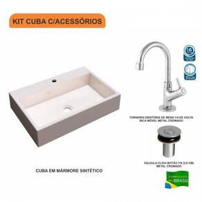 O Kit KTCART550W.CL.1198.V02 é uma combinação perfeita da Cuba de Apoio CART550W.CL com acessórios complementares, prontos para instalação no seu lavabo ou móvel de banheiro. Ele conta com 1 Cuba de Apoio Retangular Florenza 54X36,5cm Colorida e 1 Torneira de Mesa para Lavatório SL1198 1/4 Volta Metal Cromado e 1 Válvula para Lavatório Click Up Interno 1 Polegada (2,6cm) V02 Metal Cromado, todos compatíveis e prontos para instalação. Acompanha Flexível: Não Acompanha Manual de Instalação: Sim Acompanha Sifão: Não Acompanha Torneira: Sim Altura: 11 cm Altura da Torneira: 19 cm Comprimento: 54 cm Cor: Bege Cor do Produto: Bege Diâmetro do furo: 32 mm Diâmetro para válvula: 40 mm Informações Complementares: Itens Inclusos: 1 Cuba de Apoio, 1 Torneira de mesa baixa, 1 Válvula de Escoamento Clik Up Largura: 36 cm Linha ou Coleção: Conect Manual de Montagem e Instalação: https://cdn2.madeiramadeira.com.br/atributo/compace/669791-ktcart550wcl1198v02.rar Material da Torneira: Latão Material Principal: Mármore Sintético Origem do Produto: Nacional Peso: 10 kg Possui furação para torneira: Sim Possui ladrão: Não Pressão Máxima da Torneira: 40 mca Pressão Mínima da Torneira: 2 mca Recomendações de Uso, Manutenção e Limpeza: Utilize flanela seca ou pano macio, levemente umedecido com água. Evite contato com produtos químicos e abrasivos (solventes, thinner, acetona etc) e não utilize nenhum tipo de esponja de aço. Para maior brilho, recomendamos a utilização de cera automotiva n° 2. Tipo de Acionamento da Torneira: 1/4 de volta Válvula oculta: Não