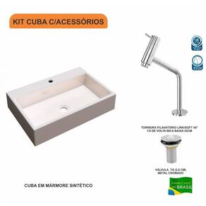 O Kit KTCART550W.CL.1060.V01 é uma combinação perfeita da Cuba de Apoio CART550W.CL com acessórios complementares, prontos para instalação no seu lavabo ou móvel de banheiro. Ele conta com 1 Cuba de Apoio Retangular Florenza 54X36,5cm Colorida e 1 Torneira para Lavatório Pratika 45° 1/4 Volta Bica Baixa 22cm Metal Cromado e 1 Válvula para Lavatório 1 Polegada (2,6cm) V01 Metal Cromado, todos compatíveis e prontos para instalação. Acompanha Flexível: Não Acompanha Manual de Instalação: Sim Acompanha Sifão: Não Acompanha Torneira: Sim Altura: 11 cm Altura da Torneira: 22 cm Comprimento: 54 cm Cor: Bege Cor do Produto: Bege Diâmetro do furo: 32 mm Diâmetro para válvula: 40 mm Informações Complementares: Itens Inclusos: 1 Cuba de Apoio, 1 Torneira de mesa baixa, 1 Válvula de Escoamento Largura: 36 cm Linha ou Coleção: Conect Manual de Montagem e Instalação: https://cdn2.madeiramadeira.com.br/atributo/compace/677216-ktcart550wcl1060v01.rar Material da Torneira: Latão Material Principal: Mármore Sintético Origem do Produto: Nacional Peso: 10 kg Possui furação para torneira: Sim Possui ladrão: Não Pressão Máxima da Torneira: 40 mca Pressão Mínima da Torneira: 2 mca Recomendações de Uso, Manutenção e Limpeza: Utilize flanela seca ou pano macio, levemente umedecido com água. Evite contato com produtos químicos e abrasivos (solventes, thinner, acetona etc) e não utilize nenhum tipo de esponja de aço. Para maior brilho, recomendamos a utilização de cera automotiva n° 2. Tipo de Acionamento da Torneira: 1/4 de volta Válvula oculta: Não