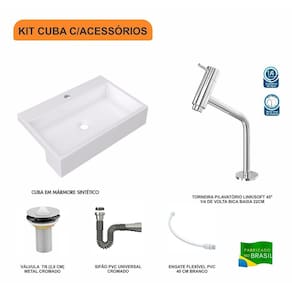 O Kit KTCXRT550W.BR.1060.AC01 é uma combinação perfeita da Cuba de Apoio CXRT550W.BR com acessórios complementares, prontos para instalação no seu lavabo ou móvel de banheiro. Ele conta com 1 Cuba de Apoio Retangular XRT55 54X36,5cm Branca, 1 Torneira para Lavatório Pratika 45 graus 1/4 Volta Bica Baixa 22cm Metal Cromado, 1 Válvula para Lavatório 1 polegada V01 Metal Cromado, 1 Sifão PVC Universal Cromado e 1 Engate Flexível PVC Branco 40cm, todos compatíveis e prontos para instalação. Acompanha Flexível: Sim Acompanha Manual de Instalação: Sim Acompanha Sifão: Sim Acompanha Torneira: Sim Altura: 11,5 cm Altura da Torneira: 22 cm Comprimento: 54 cm Comprimento do Flexível: 40 cm Comprimento Máximo do Sifão: 71 cm Comprimento Mínimo do Sifão: 29 cm Cor: Branca Cor do Produto: Branca Diâmetro de Entrada do Sifão: 1.1/4 Polegadas Diâmetro de Saída do Sifão: 1.1/4 Polegadas Diâmetro do Flexível: 1/2 Polegada Diâmetro do furo: 32 mm Diâmetro para válvula: 40 mm Informações Complementares: Sobre o ProdutoKit Cuba XRT55 C/Torneira Pratika 1060 Metal + Válvula 1'' + Sifão Pvc + Flexível BrancaDescrição do ProdutoO Kit KTCXRT550W.BR.1060.AP01 é uma combinação perfeita da Cuba de Apoio CXRT550W.BR com acessórios complementares, prontos para ins Itens Inclusos: 1 Cuba de Apoio, 1 Torneira de Mesa Baixa, 1 Válvula de Escoamento, 1 Sifão PVC Universal, 1 Engate Flexível e Manual de Instalação Largura: 36,5 cm Linha ou Coleção: Conect Manual de Montagem e Instalação: https://product-hub-prd.madeiramadeira.com.br/623883/documents/f156c39c-e0ab-469a-8fe8-076bac0b89edtcubacomtorneiracl1060ap01.pdf Material da Torneira: Latão Material do Flexível: PVC Material do Sifão: PVC Material Principal: Mármore Sintético Origem do Produto: Nacional Peso: 7,98 kg Possui furação para torneira: Sim Possui ladrão: Não Pressão Indicada do Flexível: Baixa Pressão Pressão Máxima da Torneira: 40 mca Pressão Mínima da Torneira: 2 mca Recomendações de Uso, Manutenção e Limpeza: Utilize flanela seca ou pano macio, levemente umedecido com água. Evite contato com produtos químicos e abrasivos (solventes, thinner, acetona etc) e não utilize nenhum tipo de esponja de aço. Para maior brilho, recomendamos a utilização de cera automotiva n° 2. Tipo de Acionamento da Torneira: 1/4 de volta Tipo de sifão: Flexível Válvula oculta: Não Ean: 7909903436165