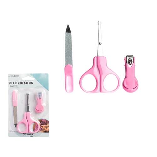 - Contém: 1 tesourinha, 1 cortador de unhas e 1 lixa; - Medidas da tesoura: 9,5cm de altura x 5,5cm de largura; - Medidas do cortador: 6,2cm de altura x 2,5cm de largura; - Medidas da lixa: 9,3cm de altura x 1,2cm de largura; - Material: plástico, aço de carbono, polipropileno e aço inoxidável; - Cor: rosa; - Manter fora do alcance de crianças.