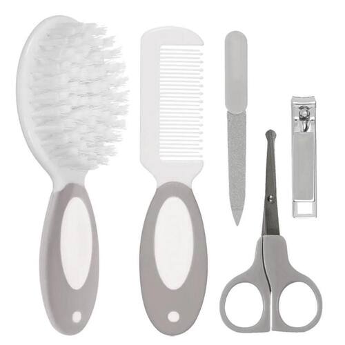 Possui pente e escova com cabo antiderrapante, lixa, cortador de unha e tesoura com bordas arredondadas ideais para as pequenas unhas do bebê.