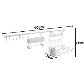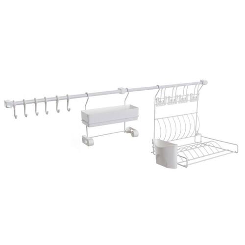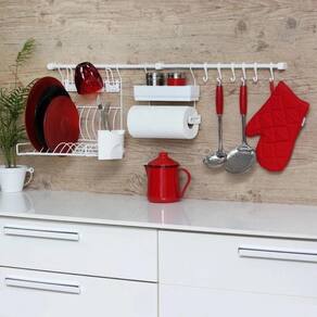 - 02 barras de 45cm; - 06 ganchos; - 01 escorredor dobrável; - 01 porta rolo de papel toalha; - 01 porta potes de tempero e condimentos; - 01 kit fixação.