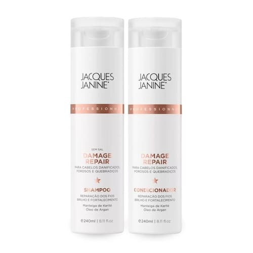 O kit de shampoo e condicionador Damage Repair da Jacques Janine tem características específicas que ajudam a tratar cabelos danificados. Em sua fórmula contém ativos que promovem a reparação da fibra capilar, restaurando a saúde dos fios.