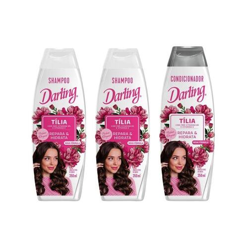 Kit darling tília 2 shampoos 350ml + 1 condicionador 350ml Descrição: O kit darling tília oferece dois shampoos e um condicionador, cada um com 350ml, formulados com extrato de tília, conhecido por suas propriedades calmantes e hidratantes. Ideal para promover uma limpeza suave e ao mesmo tempo eficaz, o kit hidrata e nutre os fios, deixando-os macios, leves e com um brilho saudável. Modo de uso: Shampoo 2 unidades : aplique o shampoo nos cabelos molhados, massageando suavemente o couro cabeludo até formar espuma. Enxágue bem e repita o processo se necessário. Condicionador 1 unidade : após o uso do shampoo, aplique o condicionador no comprimento e pontas dos fios. Deixe agir por alguns minutos e, em seguida, enxágue completamente. Marca: Não Informado