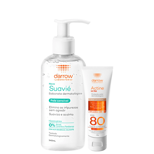 O Kit Darrow Actine Suavié Duo conta com um sabonete altamente hidratante que reduz a irritação e vermelhidão da pele, deixando um aspecto iluminado no rosto. E um protetor solar com cor com ação antioleosidade de 14 horas, além de uma textura fluida que é rapidamente absorvida. Pele protegida contra os raios UV e contra acne.