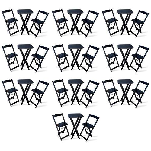 Kit De 10 Conjuntos Dobrável Bistrô Preto De Mesa Com 2 Cadeiras - Tarimatãé ideal para bares, restaurantes, estabelecimentos, áreas de lazer e tambem para sua casa. Em madeira maciça, tornando-os resistentes e duráveis. Seu design permite que esse conjunto seja encaixado em qualquer ambiente, trazendo um toque a mais para seu estabelecimento. Além de sua durabilidade, o que lhe trará conforto para servir seus clientes. Por ser dobrável torna-se mais fácil guardar, manusear e limpar o produto.Atenção: EVITE USAR PRODUTOS ABRASIVOS E QUÍMICOS PARA LIMPEZA DO PRODUTO, aconselha-se o uso de pano umedecido para melhor conservação mantenha o produto fora de chuva e sol constantes.*imagens meramente ilustrativas*çMedidas Mesa Bistrô:Tampo 54cm x 45cmAltura 98cmçDimensões Cadeira Bistrô:Altura da cadeira aberta 95cmAltura da cadeira fechada 105cmAltura até o assento 61cmLargura 41,5cmLargura vão do assento 37,5cmProfundidade 43cmProfundidade do assento 32cmKit de 10 Conjuntos DobrÃvel Bistrà Preto de Mesa com 2 Cadeiras