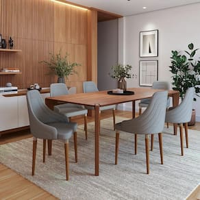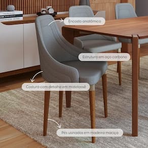 Pés usinados em madeira maciça com acabamento em pintura PU de alta resistência e sapatas de proteção.