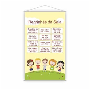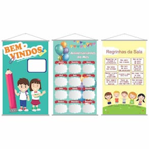 Os Banners Pedagógicos são excelentes para trabalhar de uma forma interativa o desenvolvimento dos alunos, facilitando na hora de ensinar e memorizar cada passo.Kit de Banners Pedagógicos com:- 1 um Aniversariantes- 1 um Regrinhas da Sala- 1 um Banner Bem VindosESPECIFICAÇÕES:Lona Vinílica altamente resistente com tamanho de 80x50cm. Imagens com alta resolução de impressão em acabamento de bastões e corda, pronto para pendurar.Acabamento: Bastões de madeira + corda na parte superior.