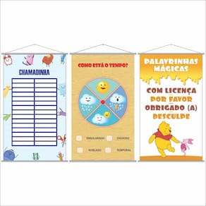 Os Banners Pedagógicos são excelentes para trabalhar de uma forma interativa o desenvolvimento dos alunos, facilitando na hora de ensinar e memorizar cada passo. Kit de Banners Pedagógicos com: - 1 um Chamadinha com 30 alunos - 1 um Palavrinhas Mágicas 1 um Como está o tempo ESPECIFICAÇÕES: Lona Vinílica altamente resistente com tamanho de 80x50cm. Imagens com alta resolução de impressão em acabamento de bastões e corda, pronto para pendurar. Acabamento: Bastões de madeira + corda na parte superior.