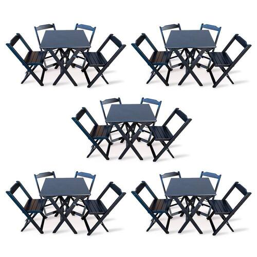Kit De 5 Conjuntos De Mesa Dobrável 60x60 Com 4 Cadeiras Preto - Tarimatãmedidas çTampo 58x60 cm çAltura 77cmé ideal para bares, restaurantes, estabelecimentos, áreas de lazer e tambem para sua casa. Em madeira maciça, tornando-os resistentes e duráveis. Seu design permite que esse conjunto seja encaixado em qualquer ambiente, trazendo um toque a mais para seu estabelecimento. Além de sua durabilidade, o que lhe trará conforto para servir seus clientes. Por ser dobrável torna-se mais fácil guardar, manusear e limpar o produto.Atenção: EVITE USAR PRODUTOS ABRASIVOS E QUÍMICOS PARA LIMPEZA DO PRODUTO, aconselha-se o uso de pano umedecido para melhor conservação mantenha o produto fora de chuva e sol constantes.*imagens meramente ilustrativas* Marca: TARIMATA