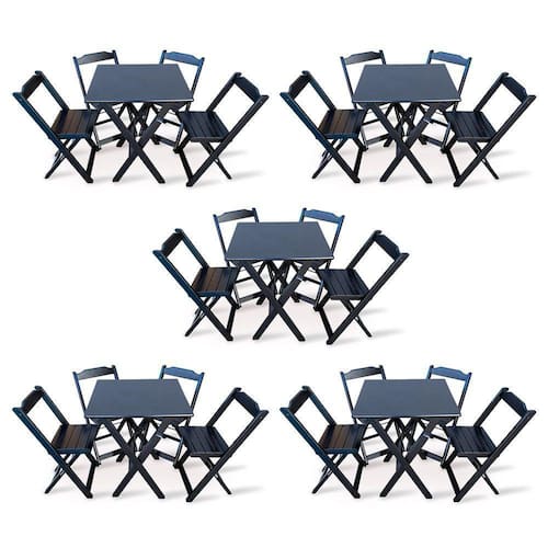 Kit De 5 Conjuntos De Mesa Dobrável 60x60 Com 4 Cadeiras Preto - Tarimatãmedidas çTampo 58x60 cm çAltura 77cmé ideal para bares, restaurantes, estabelecimentos, áreas de lazer e tambem para sua casa. Em madeira maciça, tornando-os resistentes e duráveis. Seu design permite que esse conjunto seja encaixado em qualquer ambiente, trazendo um toque a mais para seu estabelecimento. Além de sua durabilidade, o que lhe trará conforto para servir seus clientes. Por ser dobrável torna-se mais fácil guardar, manusear e limpar o produto.Atenção: EVITE USAR PRODUTOS ABRASIVOS E QUÍMICOS PARA LIMPEZA DO PRODUTO, aconselha-se o uso de pano umedecido para melhor conservação mantenha o produto fora de chuva e sol constantes.*imagens meramente ilustrativas*Kit de 5 Conjuntos de Mesa DobrÃvel 60x60 com 4 Cadeiras Preto - TarimatÃ