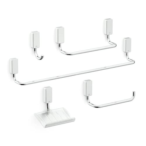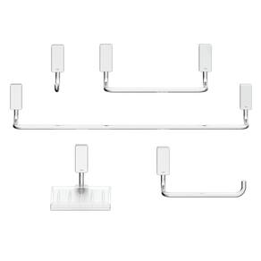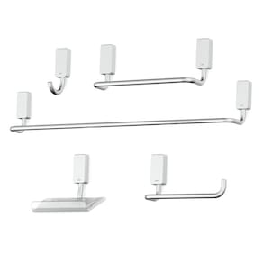 Produto composto por 5 peças: cabide, papeleira, saboneteira, porta-toalha de rosto e porta-toalha barra.