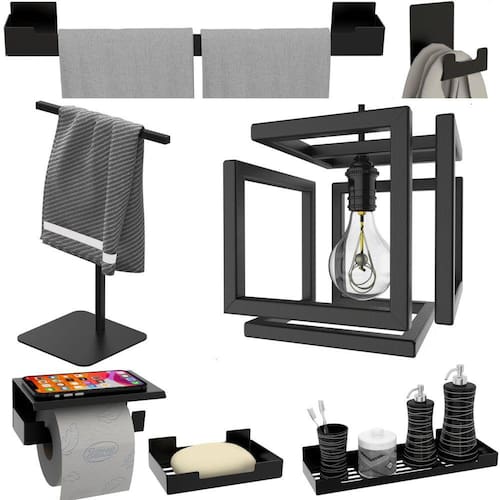 Transforme seu banheiro em um espaço moderno e funcional com o Kit de Acessórios 6 pçs Adesivo Preto + Pendente Infinity Fassin Nice.Este conjunto inclui tudo o que você precisa para organizar e decorar seu banheiro com praticidade e estilo.Com seu design moderno e elegante do Kit de Acessórios 6 pçs Adesivo Preto + Pendente Infinity Fassin Nice combina com qualquer estilo de decoração, proporcionando um toque de sofisticação ao seu banheiro. A Luminária de Teto Infinity Industrial Preto oferece não apenas iluminação, mas também um design contemporâneo que valoriza cada detalhe do seu banheiro. Uma adição moderna que faz toda a diferença.ESPECIFICAÇÕES TÉCNICAS Elegance Adesivo:Material: Aço InoxAcabamento: Pintura Eletrostática EpóxiCor: PretoTodos os itens são enviados com fita dupla face da marca 3M.ESPECIFICAÇÕES TÉCNICAS Porta Toalha Rosto de Bancada Nice:Material: Aço CarbonoAcabamento: Pintura Eletrostática EpóxiCor: Preto FoscoTratamento AntiferrugemESPECIFICAÇÕES TÉCNICAS PENDENTE:Ambientes Indicado: Área interna.Pintura: Eletrostática EpóxiLâmpada Inclusa: NãoCor do Pendente: Preto FoscoCor da Canopla do Teto: Preto FoscoCor do Cabo: PretoCor do Soquete (Bocal): PretoMaterial do Pendente: Aço CarbonoMaterial do Soquete (Bocal): Termoplástico resistente aos raios UVMaterial da Canopla do Teto: Aço CarbonoVoltagem: Bivolt (110/220V)Potência Máxima da Lâmpada: 100W (Watts)Tipo de Soquete (Bocal): E27Capacidade de Lâmpadas: 1Cabo: 2 metros (altura ajustável)Medidas: Porta Toalha de Banho: 5cm x 44cm x 5,5cmPorta Toalha de Rosto de Bancada Nice: 30cm x 13cm x 22cmPorta Papel Higiênico: 6cm x 15cm x 9cmPorta Shampoo: 7,5cm x 25cm x 3,5cmGancho: 3cm x 4,5cm x 3,5cmSaboneteira: 3,5cm x 12cm x 7,5cmPendente: 20cm x 20cm x 20cm - Medida da Canopla do teto: 12 x 12cmITENS INCLUSOS:1 - Cabide Gancho de Parede Toalha Banheiro Preto Adesivo F.ELG 40004429FS 1 - Porta Papel Higiênico Celular Papeleira Adesivo Preto F.ELG 40004444FS1 - Porta Sabonete De Banheiro Saboneteira Adesivo Preto F.ELG 40004438FS1 - Porta Shampoo Com Adesivo Suporte Banheiro Preto F.ELG 40004441FS1 - Porta Toalha De Banho Toalheiro Com Adesivo Preto F.ELG 40004435FS1 - Porta Toalha Lavabo Preto de Bancada Suporte Toalha Nice 7899772149306FS1 - Pendente Luminária Infinity Industrial Preto 1020000301FSOBSERVAÇÃO: Pendente não acompanha Lâmpada Marca: FassinShop