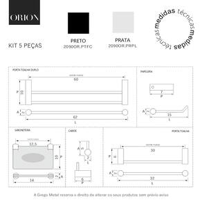 - MEDIDA TÉCNICA CM: (Cabide A5xL2xP6)-(Papeleira A2xL15xP7)-(Porta Toalha A2xL30xP6)-(Porta Toalhas Duplo A2xL60xP10)-(Saboneteira A2xL14xP10).