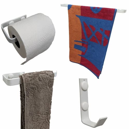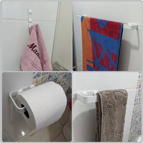 Conteúdo da embalagem. 1 porta toalhas para banho 50cm 1 porta tolha de rosto 1 porta papel higiênico 1 cabide.