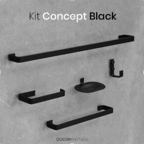 O kit da Linha Concept da Ducon Metais possuí 5 peças produzidas em metal, além disso, tem linhas retas e design minimalista, ideal para deixar seu banheiro e lavabo organizado e moderno.