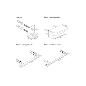 Todos os itens acompanham parafusos, buchas e tampas de acabamento para esconder a cabeça do parafuso.