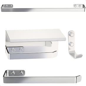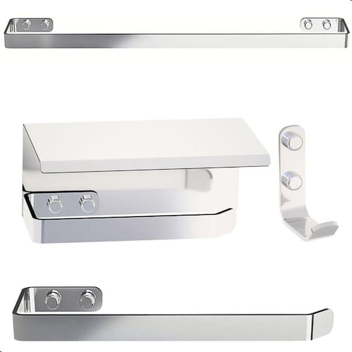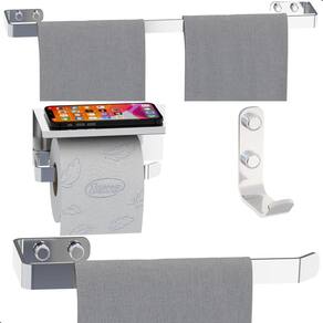 O Kit de Acessórios para Banheiro MAX possuem um design clean e sofisticado, suas barras são de alumínio maciço, o porta shampoo e porta sabonetes são de aço inox, ambos com excelente acabamento, garantindo maior durabilidade e resistência, não havendo problemas com ferrugem.