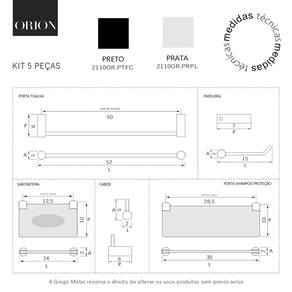 - Adquira estas delicadas peças e comece a desenhar o seu projeto beneficiando a toda família. Agora é só instalar e desfrutar da praticidade do kit 5 peças composto por 1 cabide, 1 papeleira, 1 porta toalha 50cm, 1 saboneteira, 1 porta shampoo que você comprou na Grego Metal - sua melhor escolha.