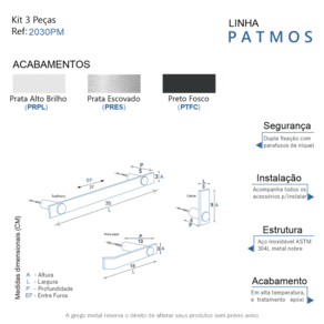 ITENS ENVIADOS: 1 cabide, 1 porta papel higiênico, 1 toalheiro 35cm, kit de parafusos e manual instrução instalação.