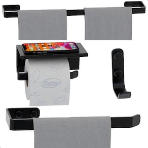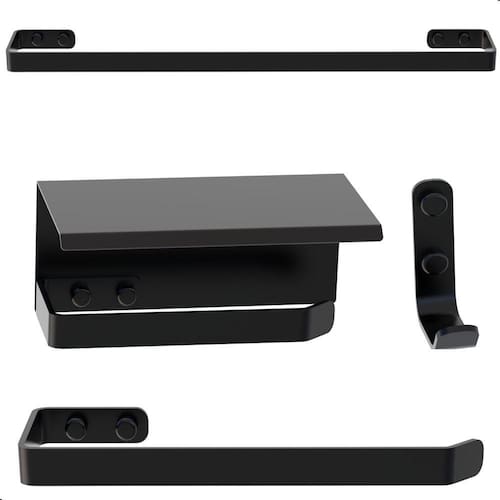As peças do kit possuem um design moderno e sofisticado, suas barras são de alumínio maciço e o porta shampoo e porta sabonetes são de aço inox, ambos com acabamento em pintura eletrostática epóxi, garantindo maior durabilidade e resistência, não havendo problemas com ferrugem.
