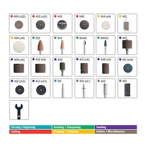 trituração/afiação: pedra de moagem de óxido de alumínio 952 (x1), pedra de moagem de óxido de alumínio 953 (x1) 1), 83142 Pedra de amolar de carboneto de silício (x1), 84922 Pedra de amolar de carboneto de silício (x1) - Acessórios de corte: 409 15/16” Thin-Cut, roda de corte (x12), 420