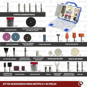 O kit conta com uma grande variedade de acessórios, como tubos de lixa, rodas de feltro, discos de esmeril, discos de corte, discos de lixa, pinças, brocas, pontas diamantadas, fresa, mandris, escova de cerdas e escova de latão. Cada item foi cuidadosamente selecionado para atender às diferentes necessidades de retificação.
