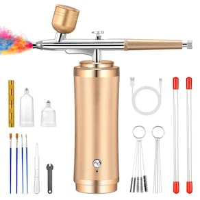 Gocheer Kit de aerógrafo com compressor - Conjunto de escova de ar recarregável sem fio de 48 PSI com bicos de 0,2/0,3/0,5 mm para arte de unhas, maquiagem, decoração de bolo, pintura de modelo, barbeiro etc. - Gocheer Kit de aerógrafo com compressor - Conjunto de escova de ar recarregável sem fio de 48 PSI com bicos de 0,2/0,3/0,5 mm para arte de unhas, maquiagem, decoração de bolo, pintura de modelo, barbeiro etc. - Bateria de longa duração: equipado com uma bateria recarregável de alta capacidade, este aerógrafo oferece mais de uma hora de uso contínuo com uma única carga. É uma escolha confiável para projetos estendidos - Sem fio e protable: o design sem fio o torna incrivelmente conveniente — sem cabos, sem limites — permitindo que você crie a qualquer hora, em qualquer lugar. Além disso, o compressor de ar compacto e leve torna este aerógrafo altamente portátil e economiza espaço valioso na mesa em comparação com outros compressores mais volumosos, seja você um iniciante ou um profissional, aproveite a liberdade de criar com facilidade - Bocal de 0,3 mm: equipado com um bocal de 0,3 mm, é perfeito para trabalhos detalhados, permitindo que você crie designs complexos com precisão. O que quer que você esteja pintando, você pode obter uma camada uniforme. Este aerógrafo é um item essencial para artistas de unhas que procuram elevar suas habilidades de arte em unhas - Fácil de usar: pronto para usar direto da caixa com montagem mínima necessária — basta fixar o compressor de ar e parafusar o reservatório. A alavanca e a válvula funcionam suavemente devido ao seu design intuitivo. e o mecanismo de não entupimento do aerógrafo garante um desempenho confiável durante o uso prolongado - Design elegante e colorido: este aerógrafo vem em três opções de cores. Os detalhes dourados e cromados dão uma aparência elegante, o design rosa claro é fofo e charmoso, e a versão preta é clássica e elegante. Além de ter uma ótima aparência, também proporciona os belos efeitos de aerógrafo que muitos sonham em alcançar - Fácil de limpar: este conjunto de pintura de aerógrafo está equipado com 3 copos de tinta de diferentes capacidades, pincéis de limpeza e agulhas de limpeza. Adicione água limpa ou detergente de limpeza ao copo de fluido do aerógrafo para unhas e borrife várias vezes até que a água pulverizada do aerógrafo esteja limpa