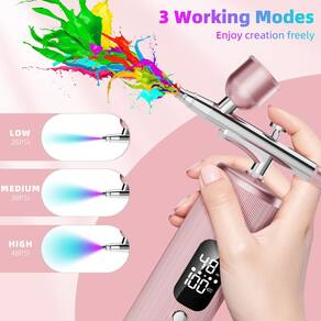 Material: aços inoxidáveis, marca livre de BPA: cor do invento: rosa Características especiais: pressão de ar ajustável em 3 marchas, fácil de usar e limpar, portátil sem fio recarregável com bateria de 6000 mAh, agulha e bico de 0,3 mm, 3 copos de capacidade diferente?1 conta-gotas de extração de líquido?1 cabo de carregamento USB-C com manual do usuário?5 limpadores de spray e 5 agulhas de lavagem e 4 pincéis?1 aerógrafo com presente Usos recomendados da caixa para o produto: como pintura, pintura de modelos, maquiagem, decoração de bolos, tatuagens temporárias, arte de unhas, tratamentos faciais, pintura de carros e capacetes, camiseta pintura, pintura de calçados e mais Faixa etária (descrição):Para iniciantes e artistas profissionais Modo de operação:Automático