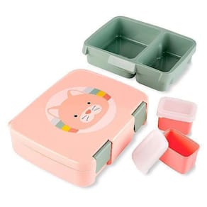Kit alimentação skip hop bento box embale porções perfeitas para crianças com nossa resistente e super fofa lancheira bento. Uma solução completa para o almoço, até os comedores mais exigentes da família vão adorar mastigar tudo o que você embalar na bandeja dividida e recipientes separados com tampas. Uma vedação segura ajuda a evitar bagunça, enquanto as travas para crianças são fáceis para as mãos pequenas abrirem e fecharem sozinhas. Melhor ainda pode ser lavado na lava-louças, então a limpeza é fácil.
