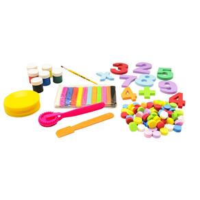 - O box inclui materiais, como massinha colorida, tinta guache e alguns jogos em madeira, como o quebra-cabeça para colorir.