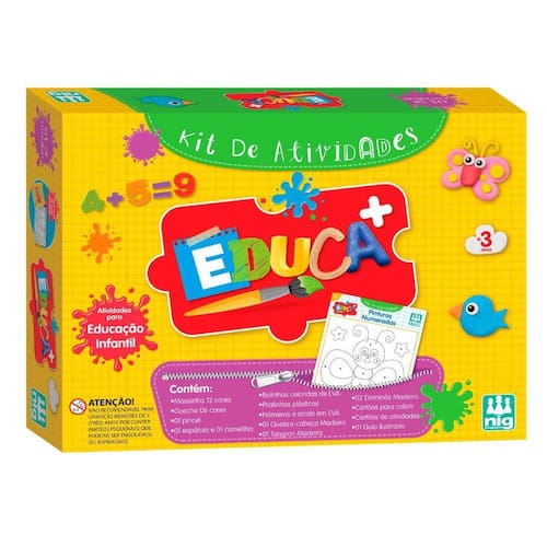 Kit De Atividades Educativas - Nig BrinquedosInformações do Produto: Este kit ajuda a desenvolver a concentração, percepção visual, memória, raciocínio lógico e coordenação motora das crianças.Itens inclusos: Massinha 12 cores, guache 6 cores, 1 pincel, 1 espátula, 1 carretilha, bolinhas coloridas de eva, pratinhos plásticos, números e sinais em eva, 1 quebra cabeça madeira, 1 tangram madeira, 2 dominós madeira, cartões para colorir, cartão de atividade, 1 guia ilustrado.Dimensões aproximadas do produto: Embalagem AxLxC 31,5cm x 8,5cm x 41cm.Recomendado: Não recomendado para crianças menores de 03 anos.Alimentação: Não Necessita.Material composição: Polipropileno, peças em madeira mdf, papel cartonado, tinta pigmentada, massinha, eva, embalagem em papel micro ondulado.Certificação: CE-BRI/IQB 446 NM 300/2002. Ocp 0006.Garantia do Fabricante: 03 meses contra defeitos de fabricação.Aviso: Todas as informações divulgadas são de responsabilidade exclusiva do fabricante/fornecedor. As cores dos tecidos ou dos produtos podem variar entre as imagens mostradas acima ou fotos da embalagem. Imagens meramente ilustrativas.