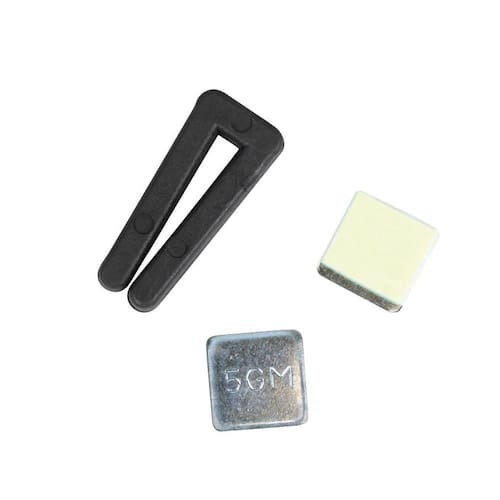 - O kit contém: dois pesos autoaderentes de 5 gramas e um clipe de equilíbrio.