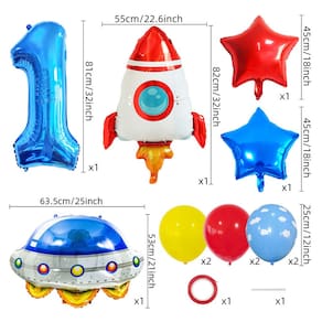 Diversão com tema espacial: Parta para uma incrível celebração de aniversário com tema espacial com um foguete, OVNI, balões em forma de estrela e um grande balão de alumínio com o número “1". Perfeito para festas espaciais infantis. Balões de alumínio de qualidade premium: feitos de papel alumínio de alta qualidade, esses balões são projetados para permanecerem inflados durante toda a festa, garantindo um toque divertido à sua decoração. Perfeito para os primeiros aniversários: este kit de balão é ideal para o primeiro aniversário do seu pequeno astronauta, com designs vibrantes com temas espaciais que encantarão meninos e meninas. Fácil de configurar: basta inflar os balões e organizá-los para criar uma configuração impressionante inspirada no espaço para sua festa de aniversário. Ótimo para sessões de fotos! Conjunto de festa completo: este kit inclui tudo o que você precisa para um aniversário memorável com tema espacial, com 10 balões de látex coloridos e 3 balões metálicos (foguete, OVNI e estrela).