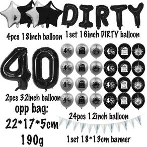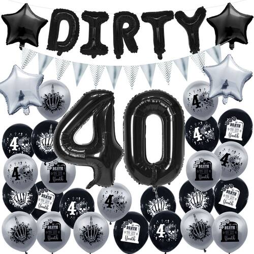 Conjunto completo de festas Dirty 40: este kit de balões inclui balões numéricos pretos e prateados, balões de látex com desenhos de caveira e caixão e um banner “Dirty 30", perfeito para uma celebração assustadora de 40 anos com tema de terror. Materiais duráveis: feitos de látex e papel alumínio de alta qualidade, esses balões são resistentes e durarão por toda a festa, adicionando um toque ousado e ousado ao seu evento. Design gótico e divertido: com um tema gótico com caveiras, caixões e um design ousado “sujo”, este kit é ideal para quem quer comemorar seu aniversário marcante com um toque divertido e não convencional. Ideal para eventos temáticos de terror: perfeito para festas de 30 ou 40 anos, este kit prepara o cenário para uma festa assustadora e aventureira que deixará uma impressão duradoura nos convidados. Configuração fácil e duradoura: encha os balões com ar ou hélio para uma configuração rápida e fácil. O papel alumínio resistente e os materiais de látex garantem que os balões permaneçam inflados durante todo o evento.