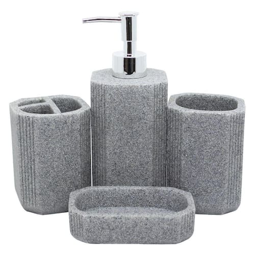 Kit acessórios de banheiro lavabo 4 peças resina pedra cinza Kit conjunto jogo para banheiro em cerâmica 4 peças O requinte e a delicadeza deste conjunto trarão para seu banheiro muita classe e beleza. Produto de altíssima qualidade e durabilidade. Material: tipo pedra O conjunto é composto por: O kit contém 4 peças: 1 porta sabonete líquido 1 porta escova 1 porta pasta 1 porta sabonete