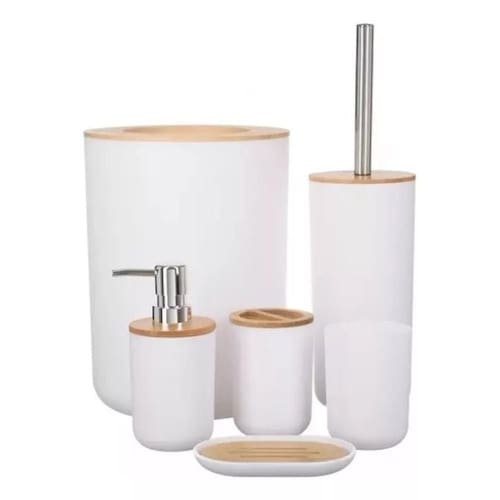 1 Porta Sabonete Líquido, 1 Porta Escova de Dentes, 1 Saboneteira, 1 Lixeira com Tampa, 1 Copo Multiuso, 1 Escova Sanitária com Suporte