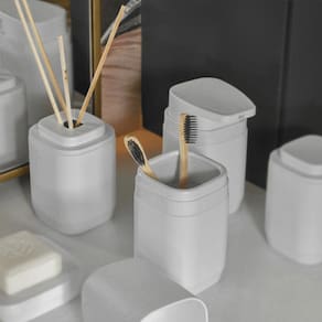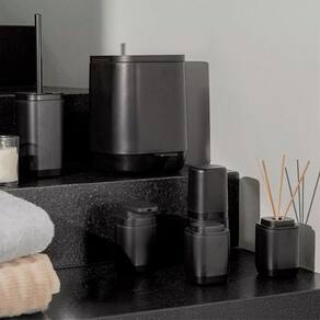 1 Escova sanitária de piso/parede 1 Lixeira de pedal com sistema de amortecimento 1 Porta-sabonete líquido 380ml com válvula ergonômica 1 Porta-escova de dentes