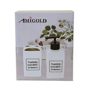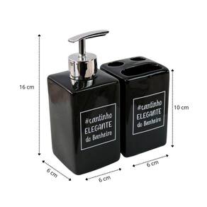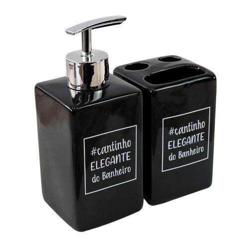 Jogo de banheiro de porcelana contendo porta sabonete e porta escovas com a frase " Cantinho elegante do banheiro" é ideal para deixar seu banheiro ou lavabo ainda mais bonito.