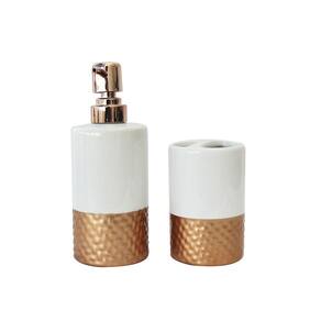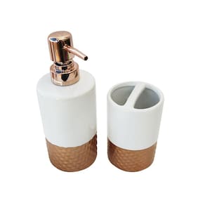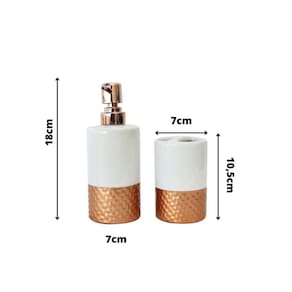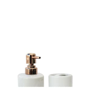 Porta sabonete com pump em plástico na cor gold rose.Produto supoer sofisticado com detalhes na peça na cor gold rose.