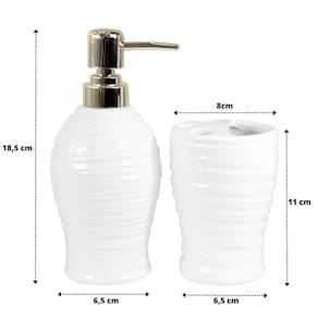 O kit de banheiro em cerâmica possui um design moderno e clean, podendo por isso ser adaptável a qualquer tipo de decoração. O bico dosador é na cor dourado.