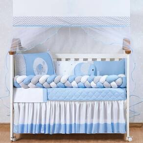 Outras peças que compõem esse kit são: 1 bandô de mosqueteiro, 1 mosqueteiro, 1 cabeceira, 1 lateral, 1 trança, 1 lençol, 1 trocador, 1 almofada elefante, 1 lençol, 1 protetor impermeável de berço. Todas essas peças são confeccionadas com tecido estampado 100% algodão, tecido colorido 100% poliéster, tecido lençol 50% algodão 50% poliéster, tule 100% poliamida, plástico 100% PVC e enchimento 100% poliéster.