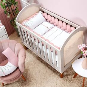 O modelo Luna é na cor rosê, o jogo de lençol e a almofada possuem lindos bordados delicados de raminhos florais com borboletas e uma trança que envolve os quatro lados do berço, proporcionando um toque macio e tornando o sono do bebê mais confortável. As peças são compostas por um zíper, para que a capa possa ser retirada para lavagem.