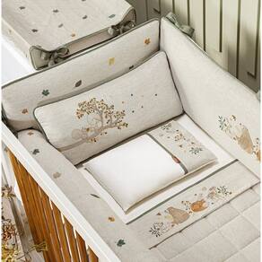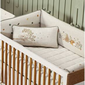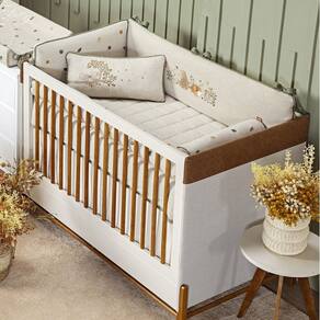O modelo é na cor bege em tecido de linho 100% algodão e com detalhes em bordados super delicados, a cabeceira e as laterais são em modelo fofo, proporcionando um toque macio e tornando o sono do bebê mais confortável.
